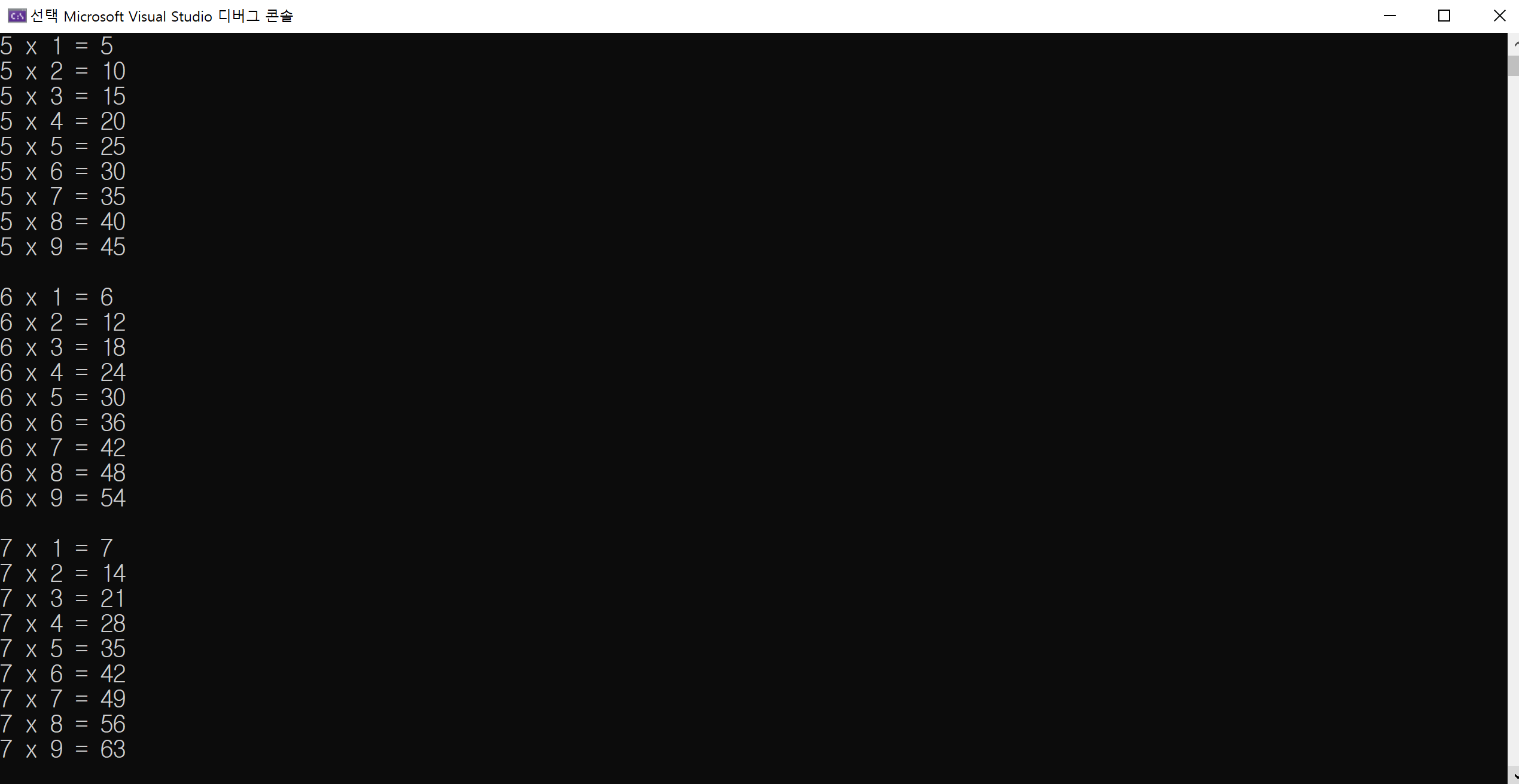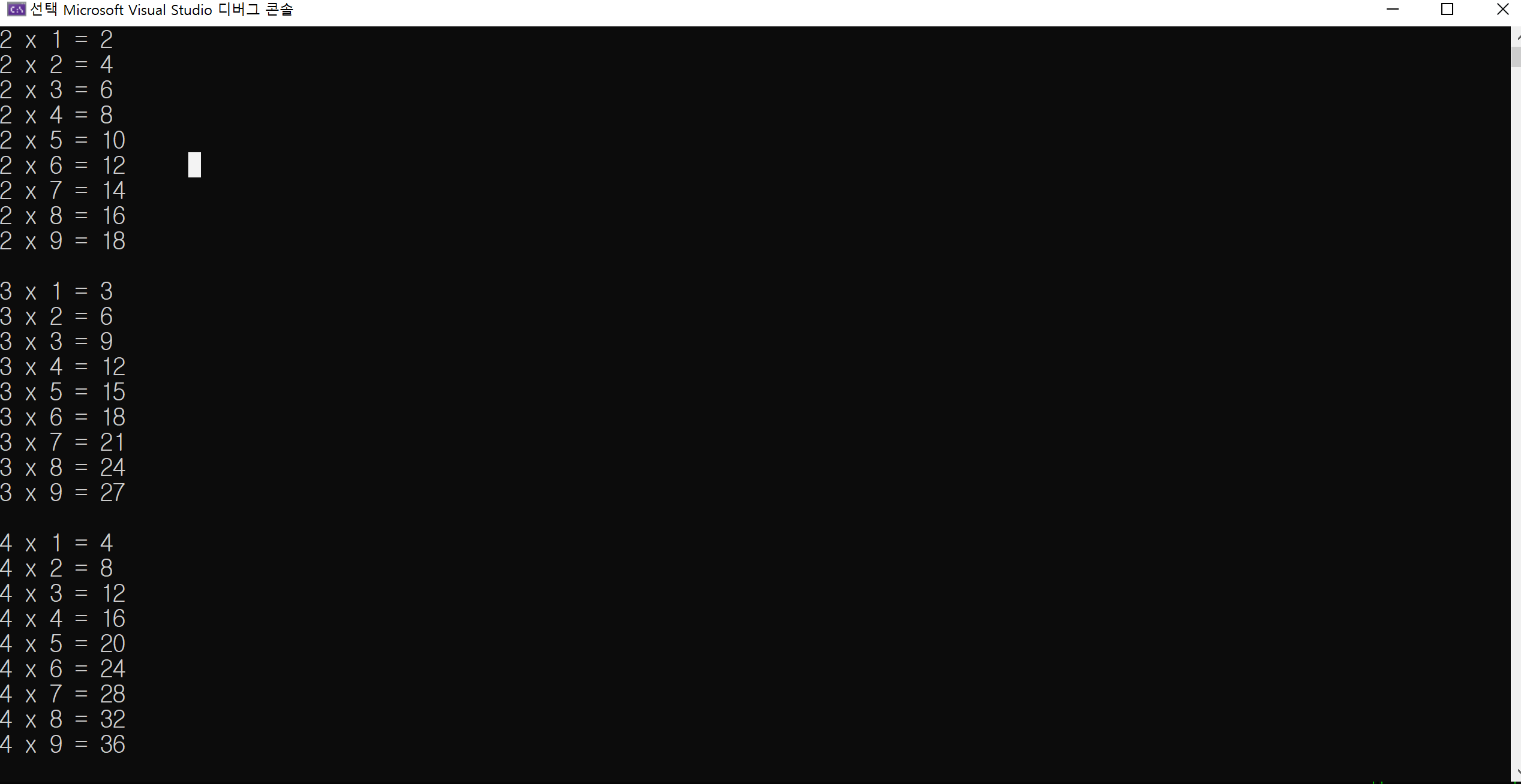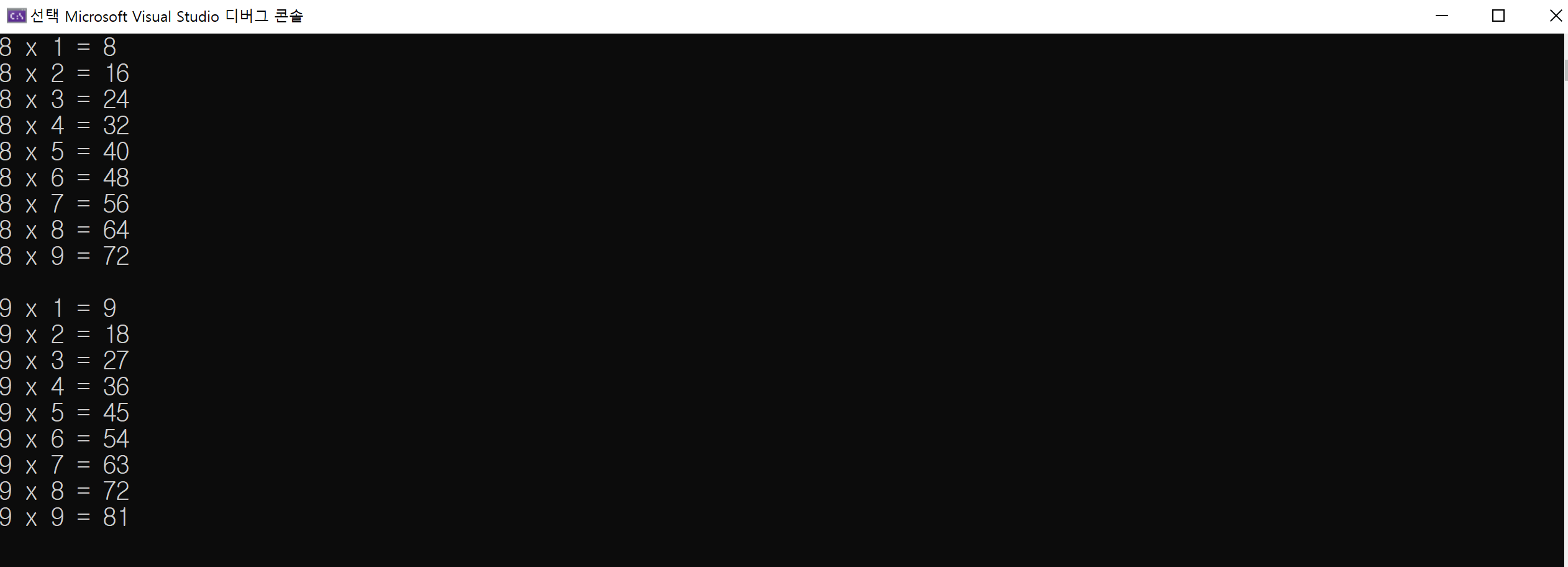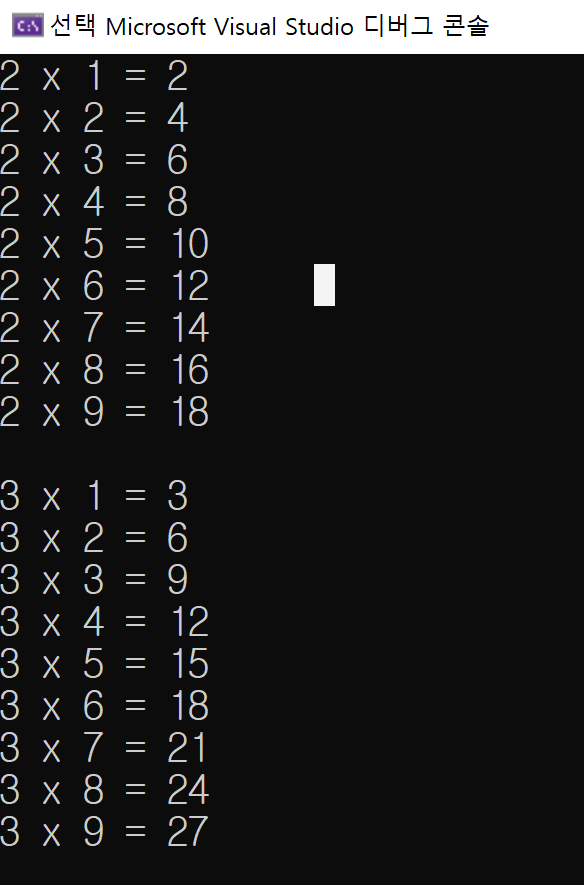 목표는 2단, 3단, 4단, ... 9단까지 차례로 곱셈을 표현하는 구구단 표를 만드는 것입니다.