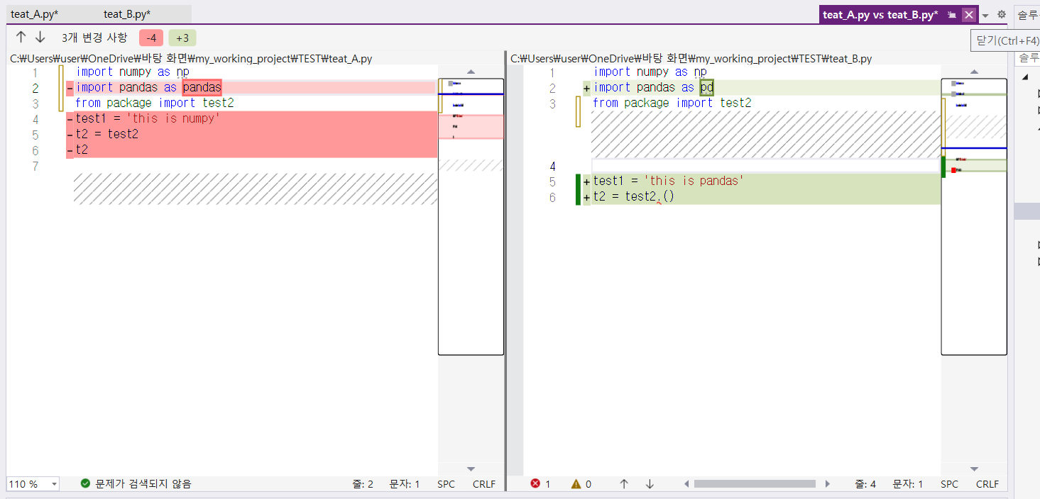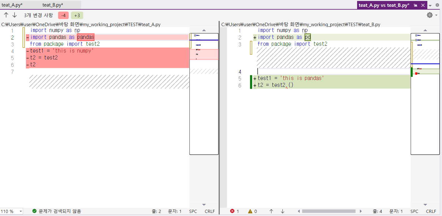 이렇게 test_A.py와 test_B.py 파일이 어떠한 부분에서 다른지 한눈에 볼 수 있습니다.