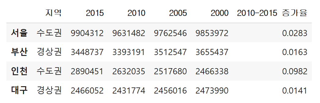 columns = ["지역", "2015", "2010", "2005", "2000", "2010-2015 증가율"]