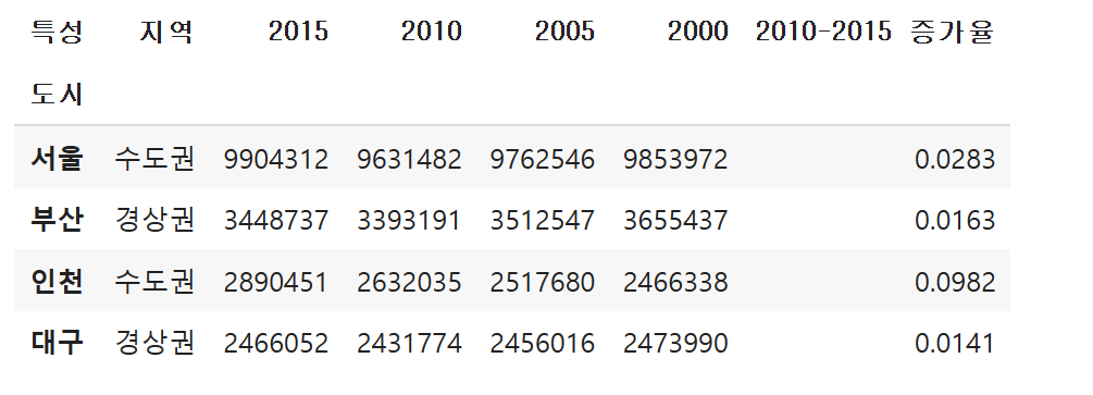Index(['지역', '2015', '2010', '2005', '2000', '2010-2015 증가율'], dtype='object')
