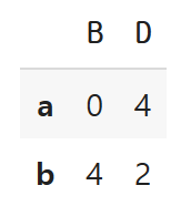 df.loc[["a", "b"], ["B", "D"]] # 리스트, 리스트 >> 행과 열만 선택