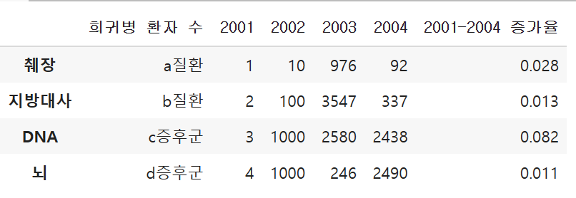 columns = ["희귀병 환자 수", "2001", "2002", "2003", "2004", "2001-2004 증가율"]