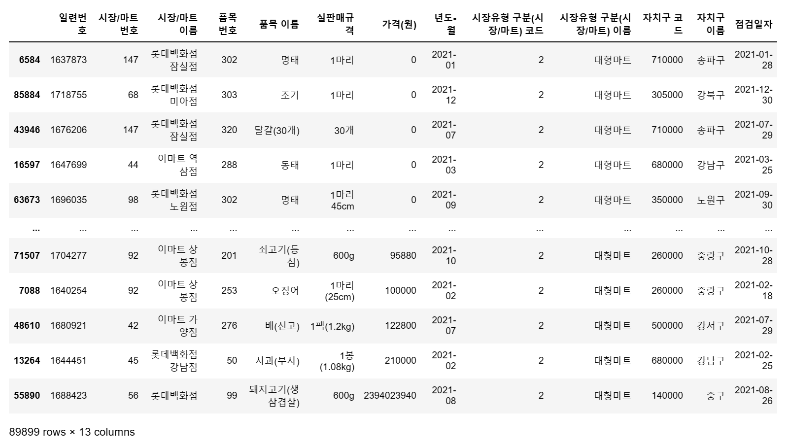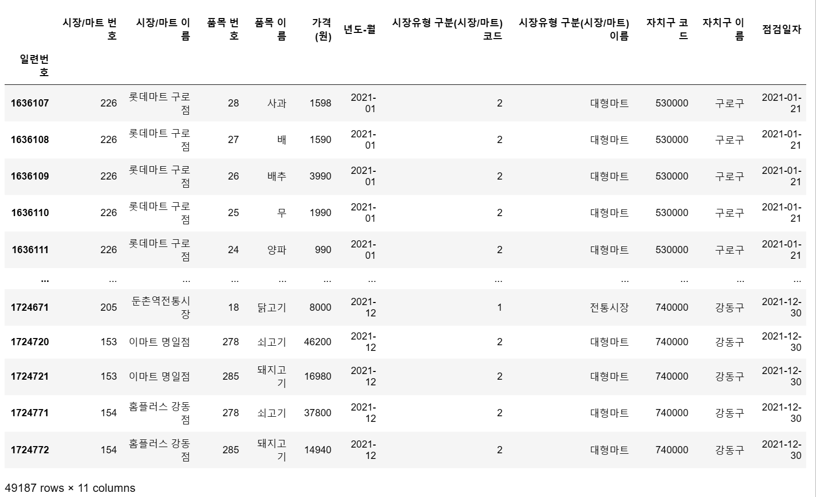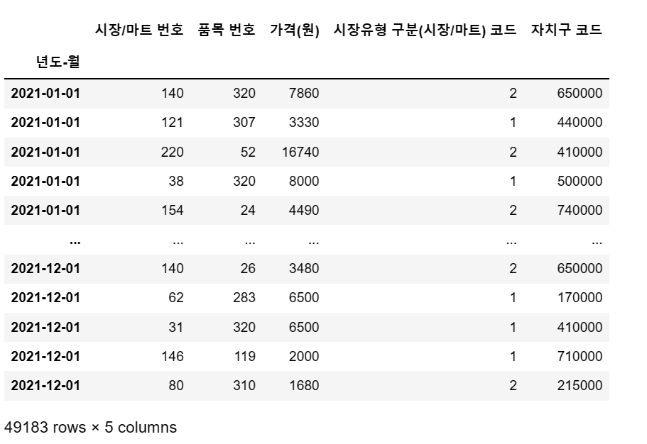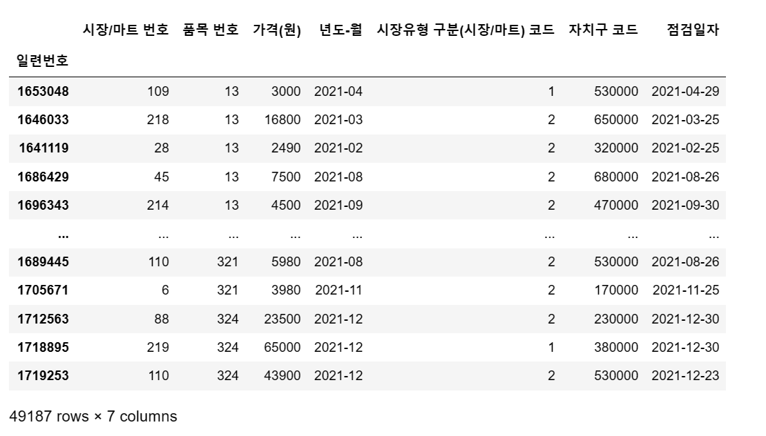df = pd.read_csv('C:/myPyCode/data/2021_물가/생필품_농수축산물_가격_정보(2021년).csv', encoding = 'cp949')