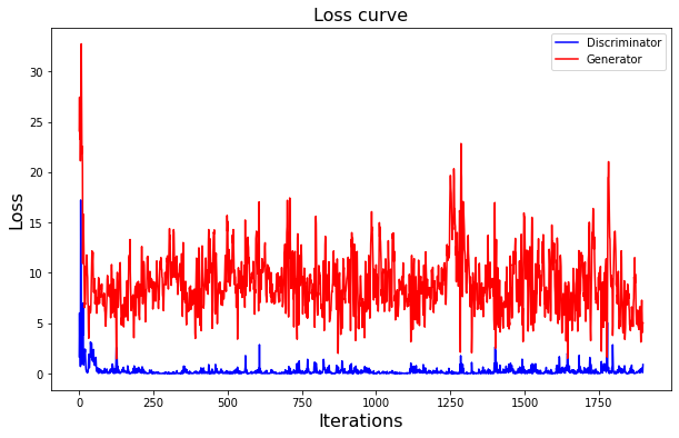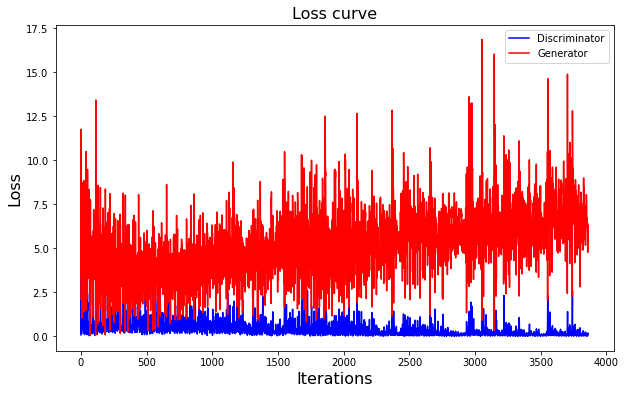 완료. 100회시의 판별자 loss, 생성자 loss는 다음과 같습니다.